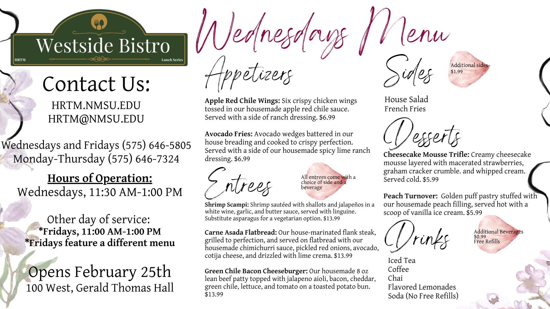100 West Café is a food laboratory for students in our HRTM 3310 and 4320 classes to provide hands on experience in food preparation and service. We have a new menu and decor courtesy of our HRTM 3210 Marketing class and are proud to introduce the Westside Bistro lunch series. We are located in Gerald Thomas Hall at 940 College Drive on NMSU's Main Campus in Las Cruces, NM.